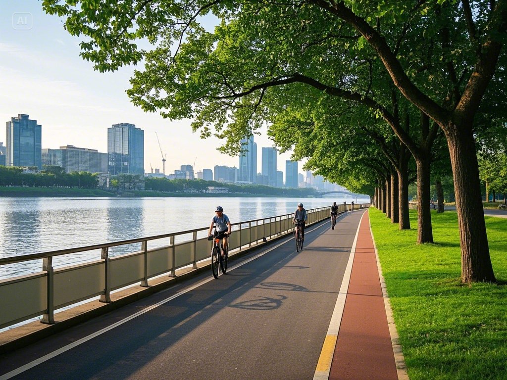 풍경은 계절마다 다르게 변하며, 봄철엔 벚꽃과 유채꽃이 함께 피어 장관을 이룹니다. 대부분의 구간이 강변을 따라 나 있어 평탄하고 안전하게 달릴 수 있으며, 주변에 편의시설과 쉼터도 다양하게 분포되어 있어 중간중간 쉬어가기 좋습니다.