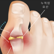 - 주로 엄지발가락 관절에 갑작스러운 통증