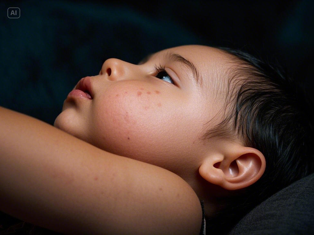홍역 특유의 붉은 발진이 얼굴에서 시작해 몸 전체로 퍼지게 돼요. 이 시기가 가장 힘든 단계예요.